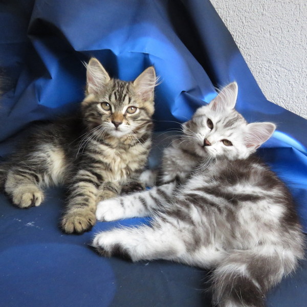 Les chatons sont nés dans la nuit du 26 mars 2025. Tout d'abord un gros mâle brown, ensuite une femelle très claire, probablement une bimétal, puis une petite pépite silver, suivie par un mâle de la même couleur et enfin, après une pause, un dernier gros mâle brown. EDIT: j'ai découvert quelques jours plus tard que les deux derniers sont aussi des femelles ;)