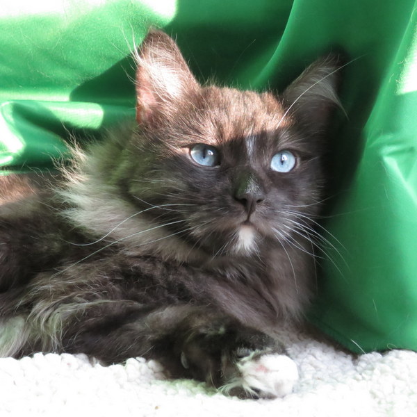 Sabrina Légende des Alpes (Brin) est à son tour née chez nous en 2021. Elle est de couleur black smoke [avec blanc]. Et surtout, elle a hérité des yeux bleus de sa maman, tout comme un de ses frères et une de ses sœurs.